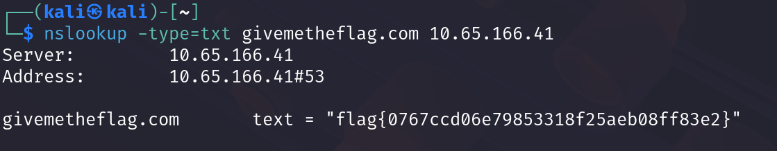 nslookup -type=txt givemetheflag.com MACHINE_IP